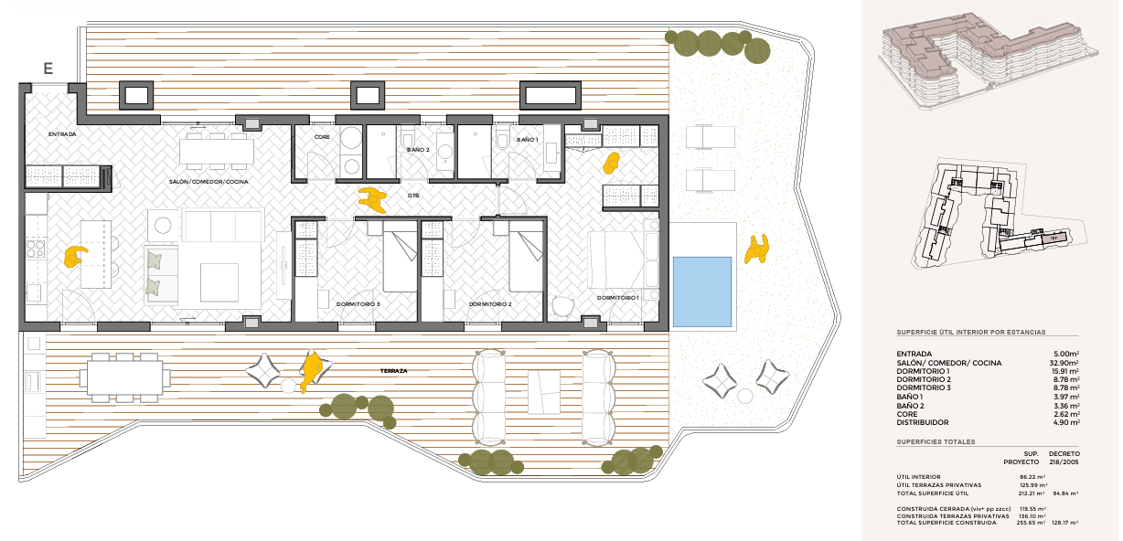 Unitat amb 3 dormitoris, 2 banys, 255 m² de superfície construïda.