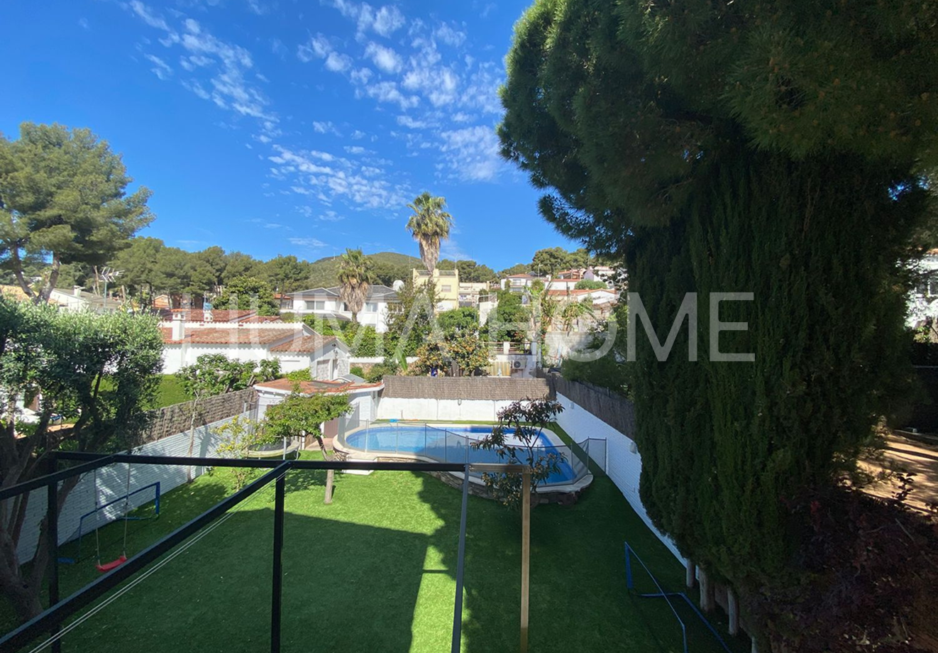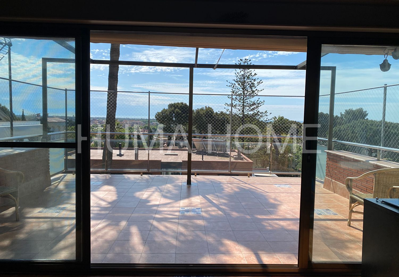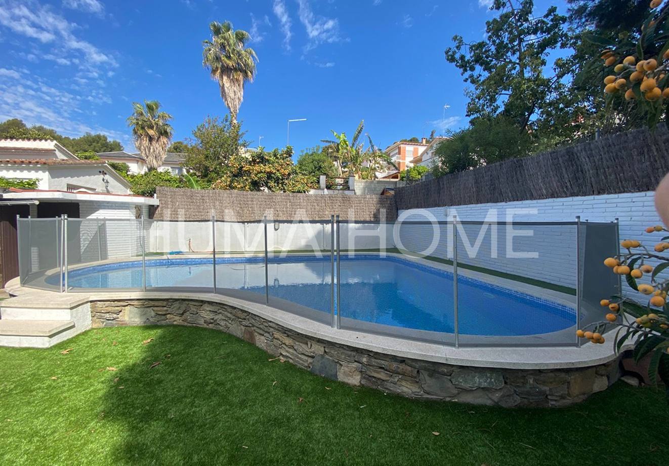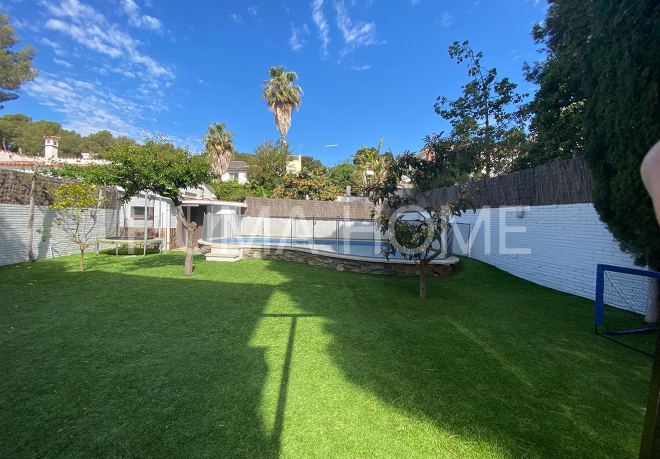 260m² Construïts, Jardí i Vistes al Mar Casa independent de 260m² en parcel·la de 460m² en una de les millors zones de Montemar, Castelldefels. Quatre plantes ben distribuïdes amb jardí cuinat i piscina d'aigua salada reformada recentment. L'habitatge compta amb quatre habitacions dobles, dos banys complets i un lavabo. La planta baixa ofereix saló-menjador amb xemeneia, cuina ampla reformada amb sortida al jardí, zona de barbacoa i piscina. La segona planta té quatre habitacions dobles exteriors, cadascuna amb balcó i dos banys. L'última planta és la joia d'aquesta casa: espai multifuncional molt ampli amb sostre alt de fusta, dos equips de climatització, projector amb pantalla i gran terrassa amb vistes al mar orientada al sud. El jardí té arbres fruiters i zona de mini golf. Garatge per a dos cotxes grans i trasters. Calefacció de gasoil per radiadors, diversos splits de climatització, terres de parquet i gres, finestres d'alumini amb mosquiteres i toldes instal·lats. Ubicació ideal, envoltada de tranquil·litat i natura, a prop del centre de Castelldefels amb tots els serveis i col·legis internacionals. Platja a 10 minuts, Barcelona a 30 minuts.
