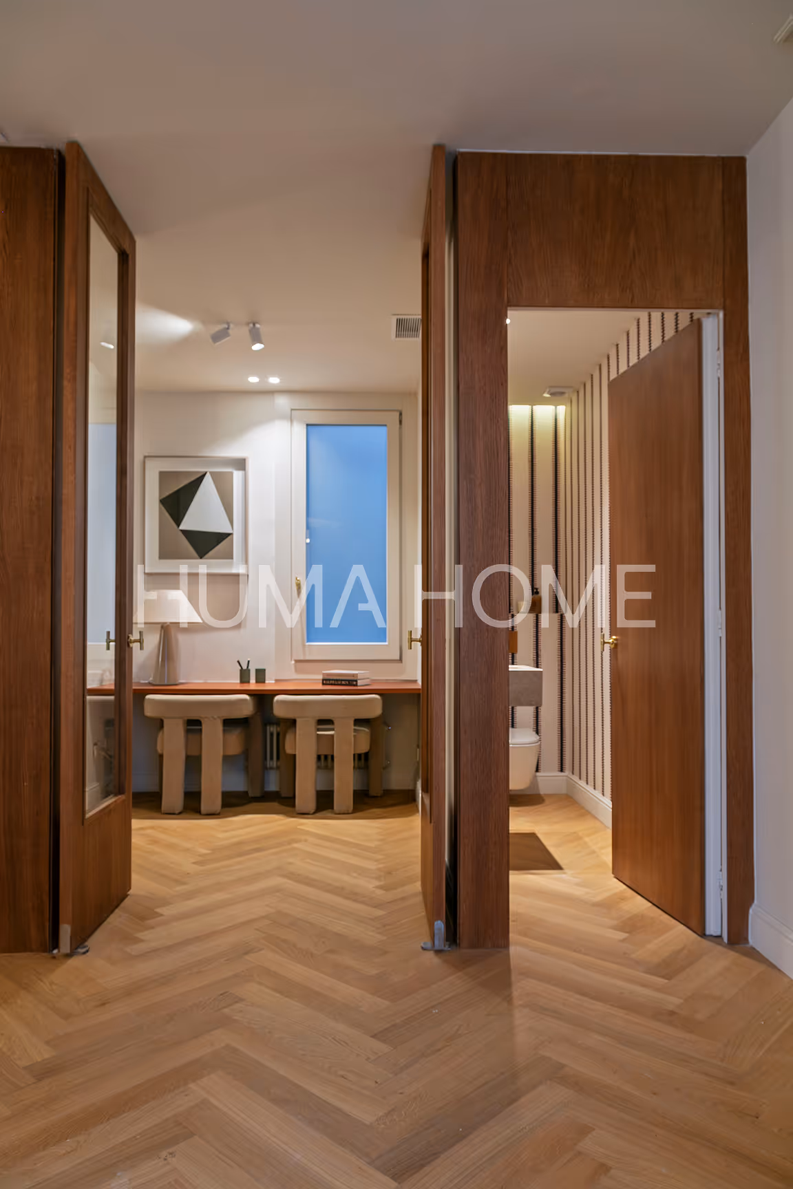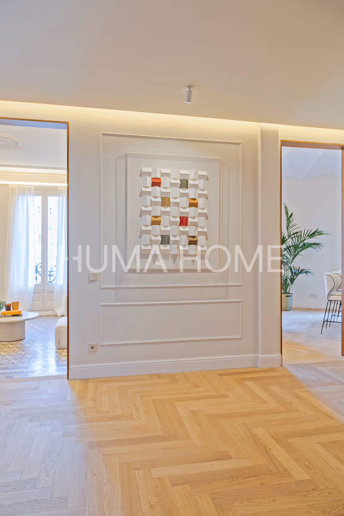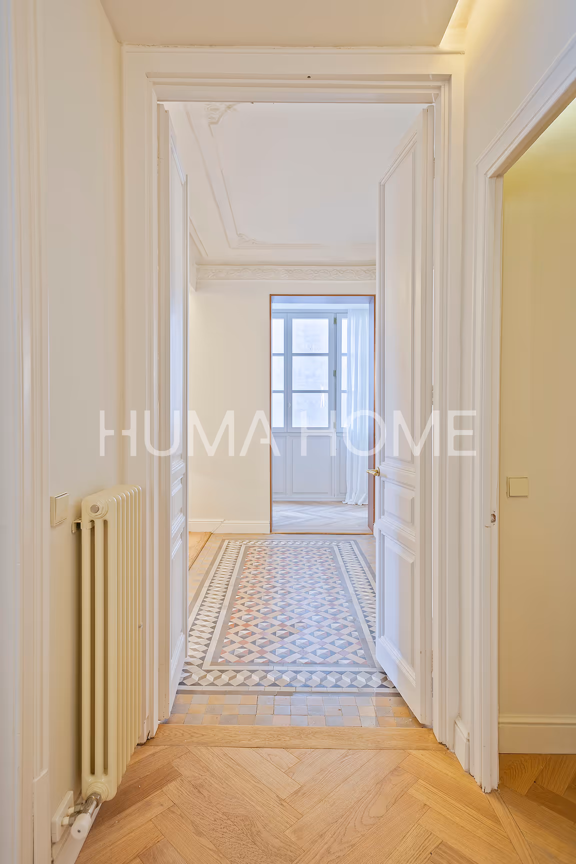 Finishes combine natural herringbone oak, original hydraulic floors, Nolla ceramic, and restored ceilings.