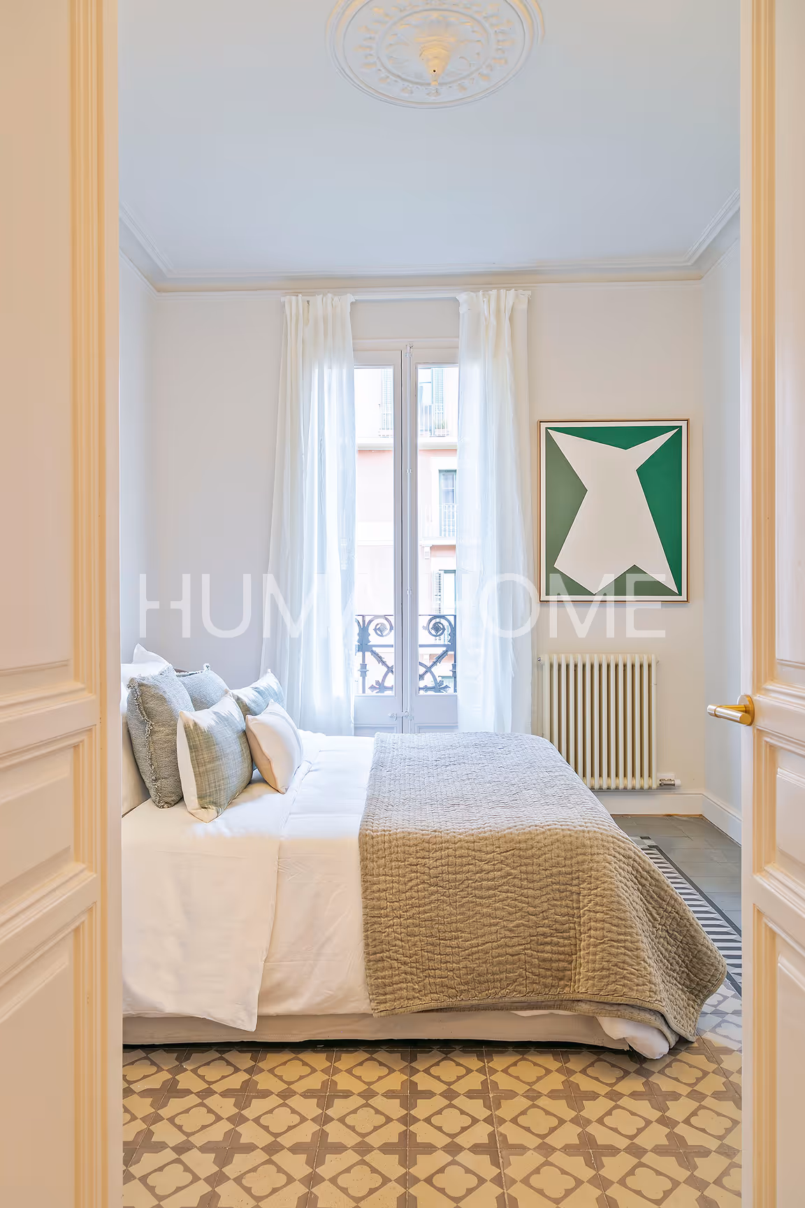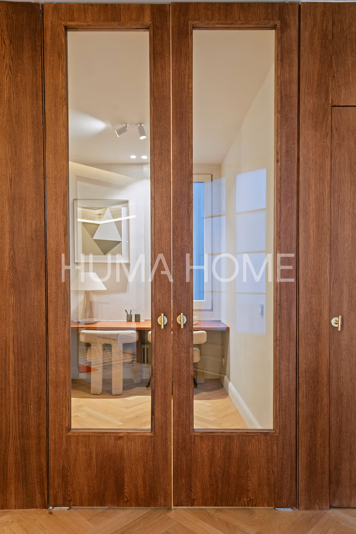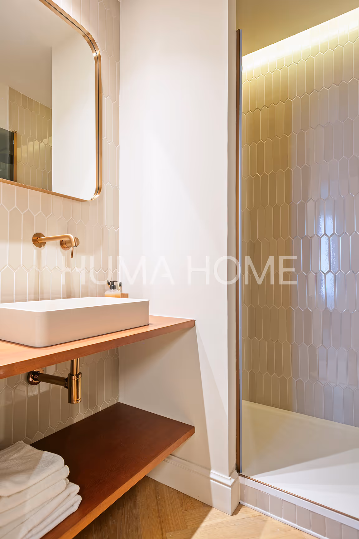 Finishes combine natural herringbone oak, original hydraulic floors, Nolla ceramic, and restored ceilings.
