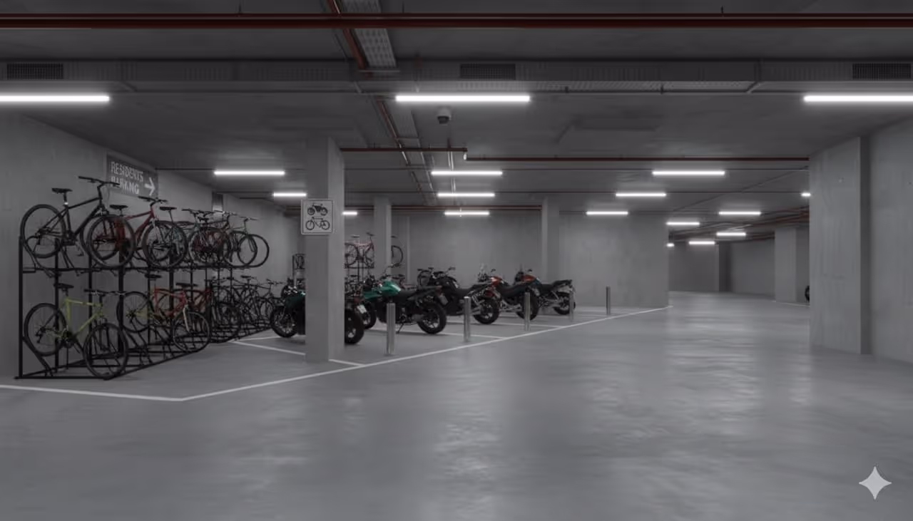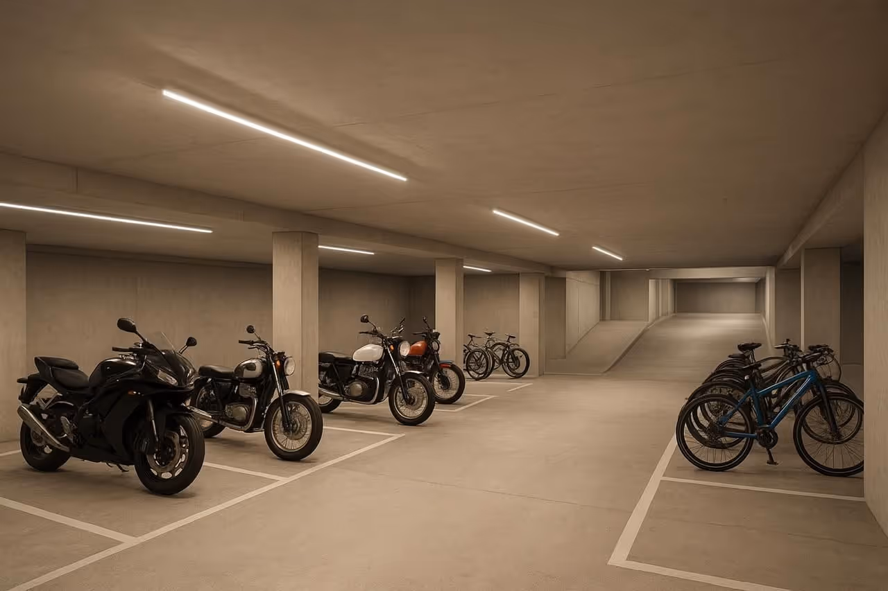 Amura Residences ofereix una varietat d'opcions d'aparcament privat dins de l'edifici, adaptades per satisfer les diferents necessitats d'espai i mobilitat. Les places d'aparcament es troben al garatge subterrani, amb accés directe des de les residències a través d'ascensor i escales, garantint la màxima comoditat, accessibilitat i seguretat. Hi ha disponibles diversos tipus d'espais: una plaça estàndard per a cotxes (20.000€), un espai ampli (22.000€) ideal per a SUV o vehicles familiars, i un espai reduït (17.000€) per a cotxes compactes. A més, la promoció inclou places per a motos (3.000€) i places per a bicicletes (250€). Totes les unitats d'aparcament estan numerades, clarament marcades, i dissenyades per permetre una circulació fluida dins del garatge.
