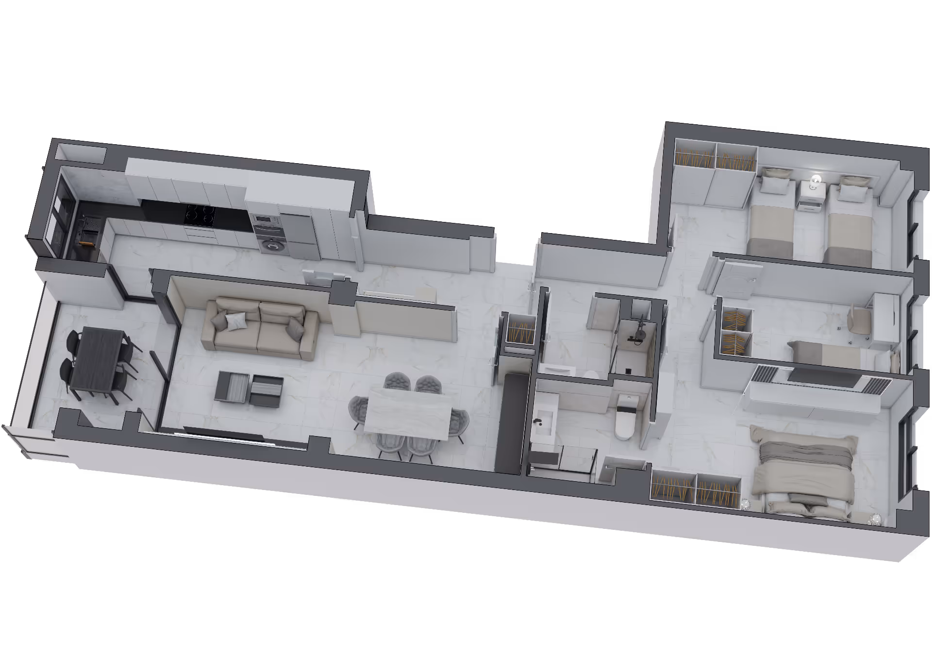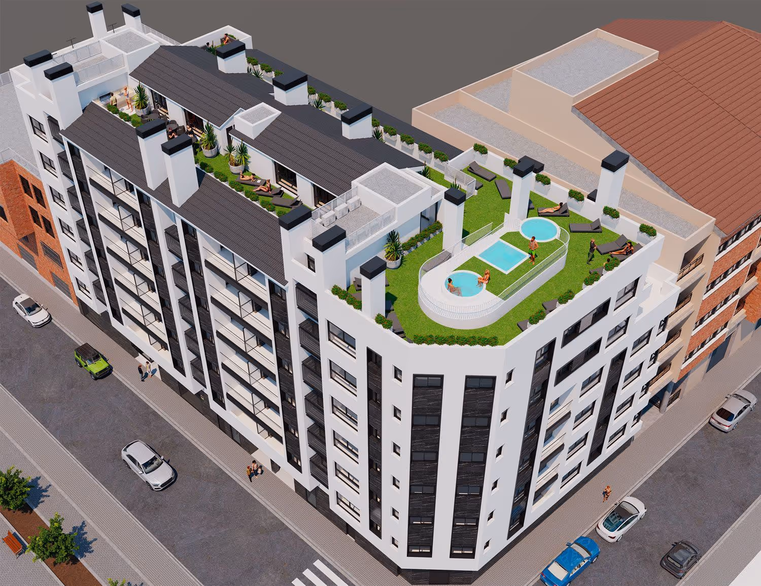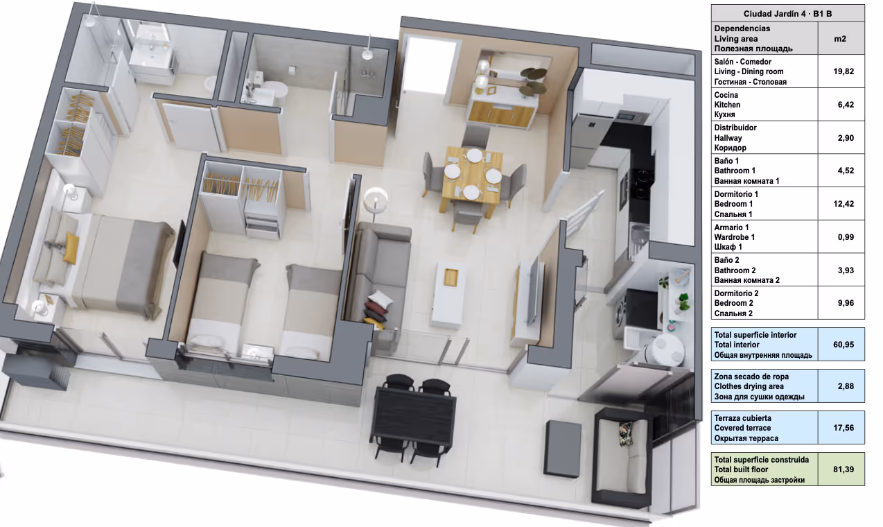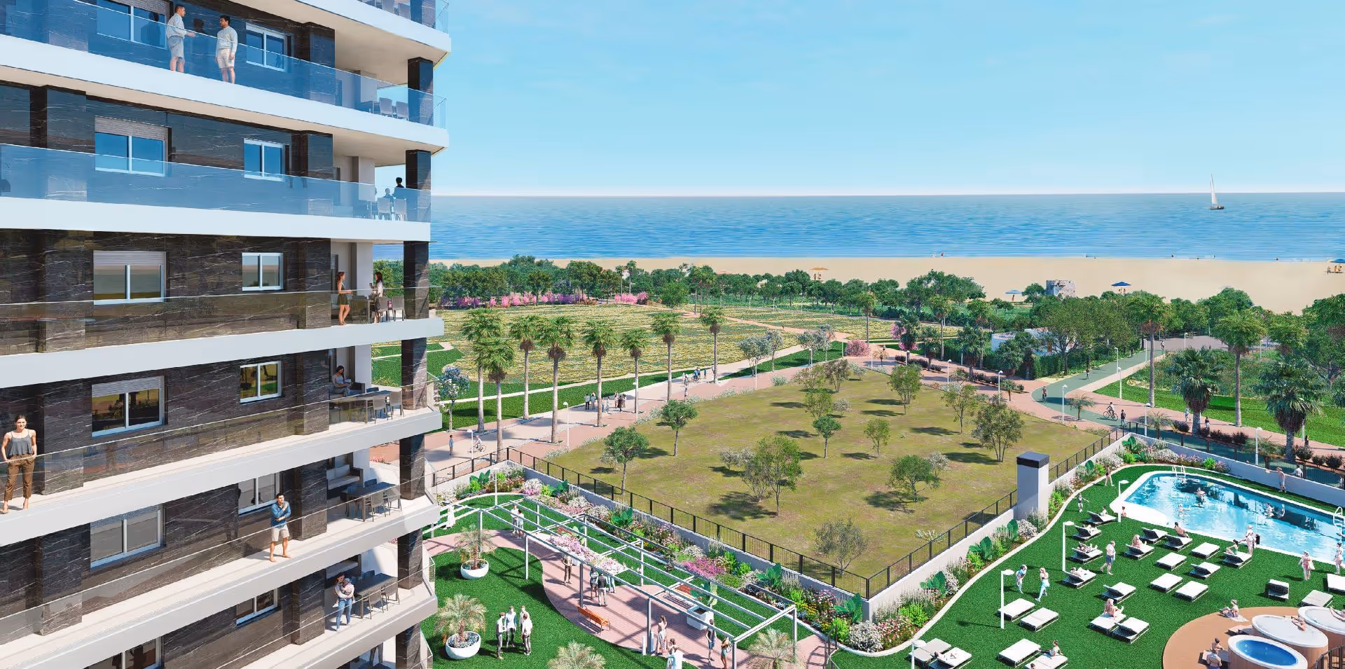 El Edificio Ciudad Jardín 4 propone una vivienda de obra nueva en primera línea de playa, con acabados orientados al confort, al uso vacacional y residencial de calidad. La envolvente exterior se proyecta para ofrecer buen aislamiento térmico y acústico, con carpinterías de aluminio con rotura de puente térmico, doble acristalamiento y terrazas amplias que permiten prolongar los espacios interiores hacia el exterior. Los interiores de las viviendas se entregan totalmente amueblados, equipados y decorados hasta el último detalle —mobiliario, electrodomésticos, vajilla, menaje, ropa de cama— para que puedan usarse desde el primer día. Suelos de gres o porcelánico de gran formato, puertas lacadas, armarios empotrados vestidos, cocinas modernas abiertas al salón, encimeras de alta gama, y baños con sanitarios vitrificados, platos de ducha extraplanos o bañera según tipología. Las instalaciones de climatización incluyen aire acondicionado por conductos, calefacción y sistema de agua caliente sanitaria eficiente. Todas las viviendas disponen de terraza con vistas al mar Mediterráneo, lo que potencia la luminosidad y confort. En cuanto a las zonas comunes, el edificio dispone de garaje subterráneo, zonas peatonales y de expansión al aire libre, piscina diferenciada para adultos y niños con iluminación interior LED, 3 spas de hidromasaje, pista deportiva, local social completamente equipado para uso de los residentes. En conjunto, Ciudad Jardín 4 presenta una propuesta residencial llave en mano en una ubicación privilegiada, donde la calidad constructiva, el confort y los servicios se combinan para ofrecer una experiencia inmediata y habitual de vivienda o de segunda residencia.