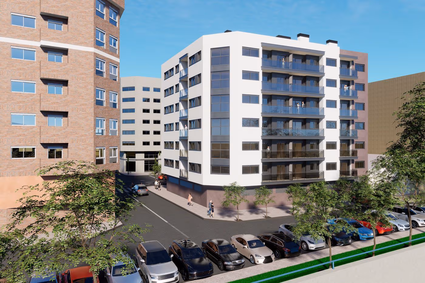 Edificio Norte representa una vivienda de obra nueva con unos acabados elegidos para ofrecer confort, funcionalidad y eficiencia. La envolvente exterior incorpora sistema de aislamiento térmico SATE, que mejora el comportamiento térmico de fachadas, forjados y carpinterías, y contribuye a que la edificación alcance la calificación energética. Las carpinterías exteriores son de aluminio con rotura de puente térmico y doble acristalamiento, asegurando buen aislamiento acústico y eficiencia energética. Se entrega puerta de acceso blindada con alarma integrada para mayor tranquilidad desde el primer día. Los suelos interiores están cubiertos con pavimentos cerámicos de gran formato o porcelánicos, las puertas de paso son lacadas y los armarios empotrados están vestidos. Las cocinas se entregan amuebladas e incluyen electrodomésticos integrados de bajo consumo; las encimeras son de cuarzo o similar, y la grifería monomando de calidad. Los baños destacan con piezas sanitarias vitrificadas, platos de ducha extraplanos o bañera según tipología, mamparas de vidrio templado y grifería de diseño. El sistema de climatización se basa en aerotermia para calefacción, refrigeración y agua caliente sanitaria, lo que reduce consumo y emisiones de CO₂. Asimismo, el edificio incorpora instalación fotovoltaica para aprovechamiento comunitario y ventilación mecánica controlada en viviendas, lo que refuerza el aislamiento térmico y la eficiencia. En cuanto a las zonas comunes, se han previsto accesos controlados, conexión a internet comunitaria durante los primeros dos años, aislamiento acústico mejorado en tabiquería, y acabados homogéneos de diseño moderno.