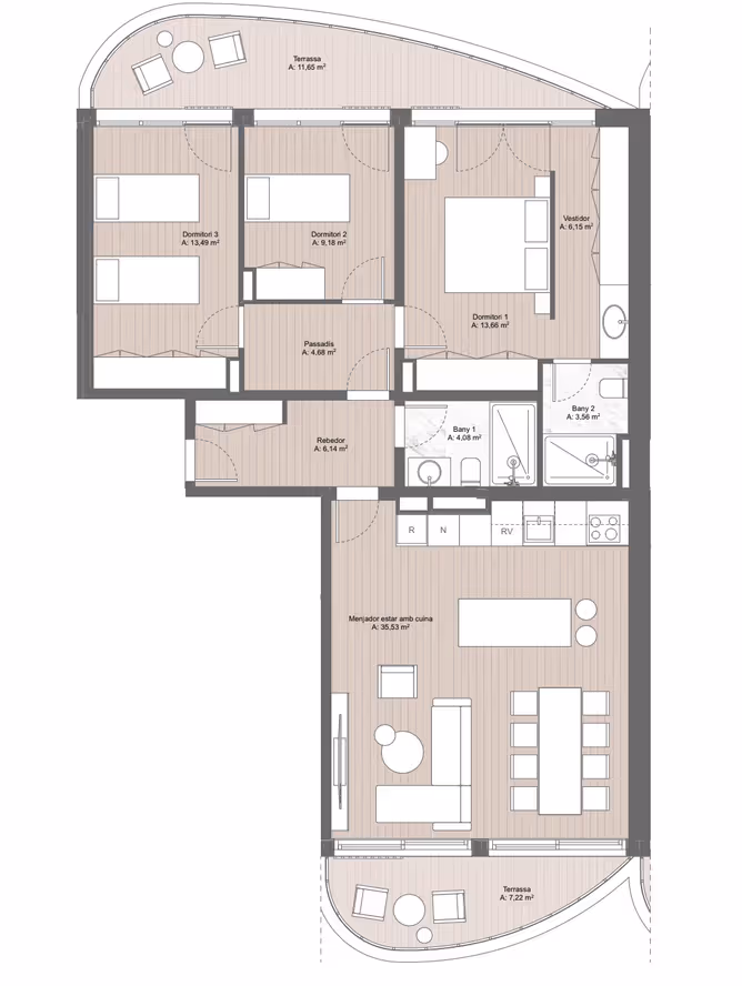 The apartments are designed with open-plan layouts that connect the living room, dining area, and kitchen to enhance the sense of space and natural light. Bedrooms are conceived as tranquil retreats, with clean lines, natural materials, and optimal orientation to promote rest and well-being.