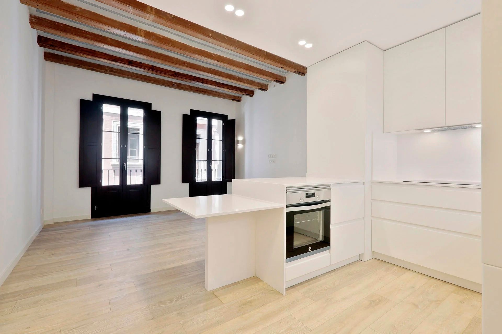 Exclusive Apartment in Historic Building — Gothic Quarter 110m² Renovated with Original Features — Escudellers 16 Authentic real estate gem in the heart of the Gothic Quarter — elegant 110m² apartment in a finely restored 1900 historic building. The property combines architectural heritage with contemporary design, preserving original elements like vaulted ceilings and wooden beams integrated with high-quality finishes. Located on a high floor with private key-operated elevator, it guarantees total privacy as the only unit per floor. The spacious, bright areas with high ceilings feature 2 double bedrooms with fitted wardrobes, 2 full bathrooms with modern design, large open-concept living-dining room with fully equipped kitchen, balconies overlooking picturesque Escudellers street, and terrace.