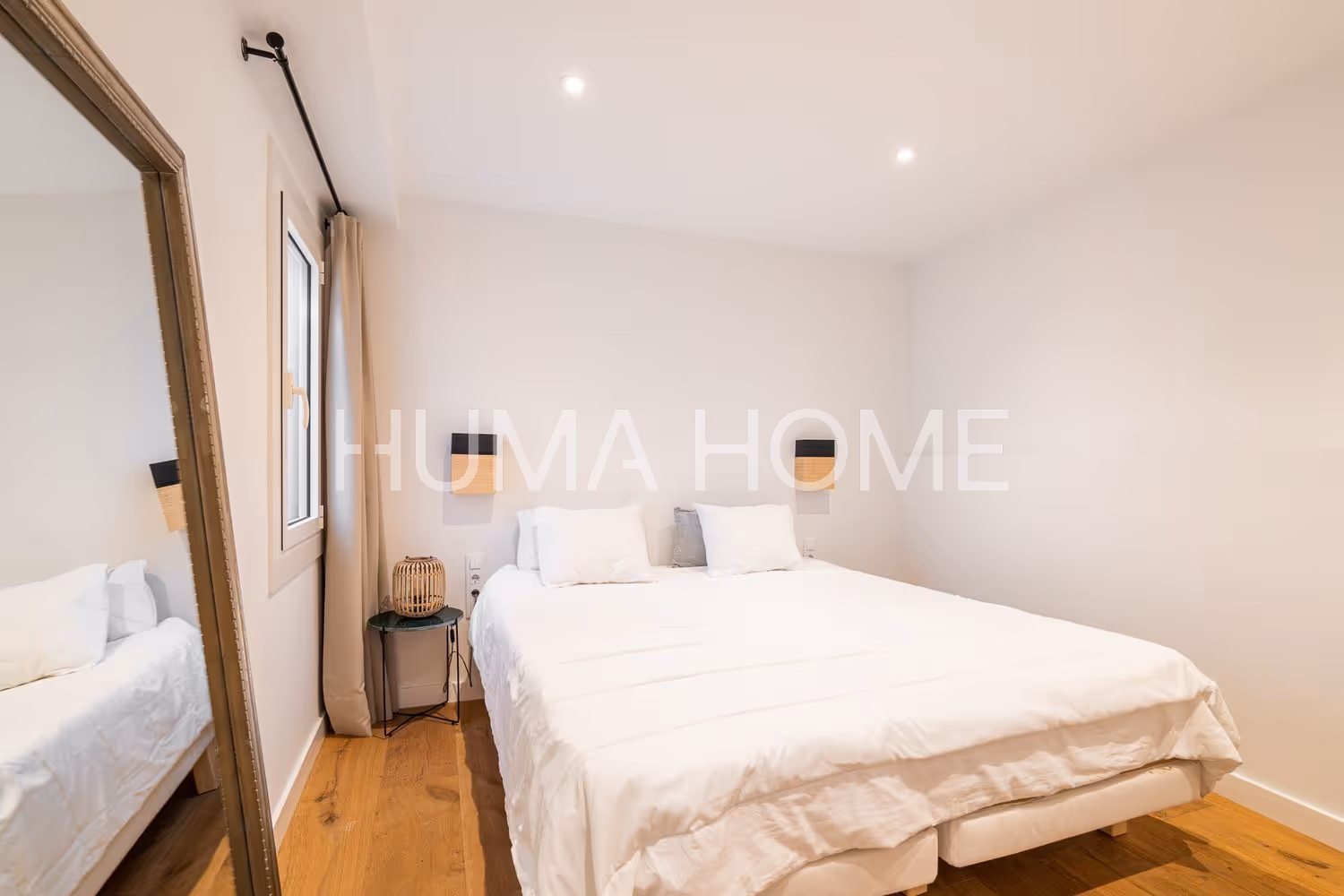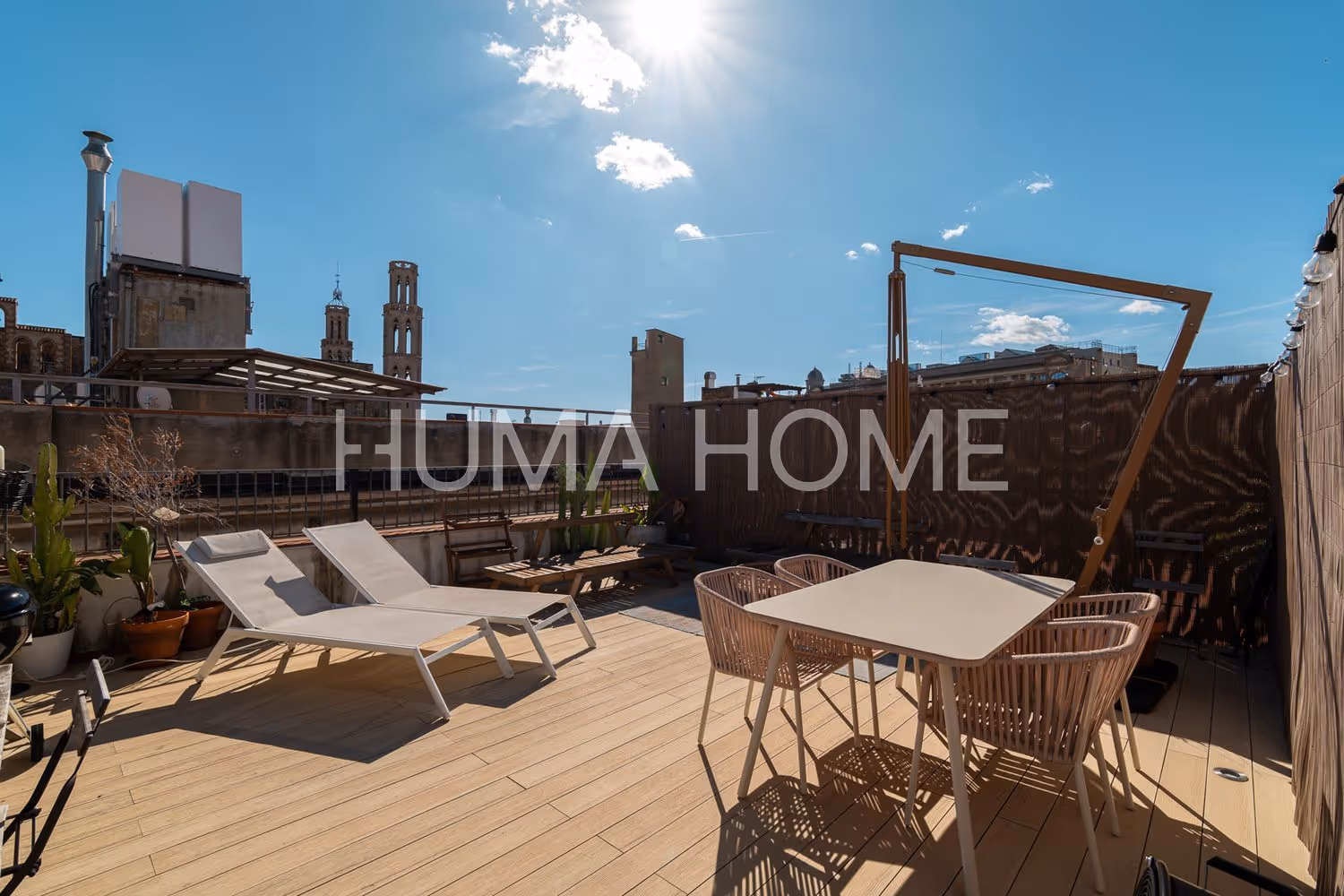 The property stands out for its high ceilings and wooden beams adding warmth and unique character. The spacious bright living room features four exterior balconies allowing natural light throughout the day.