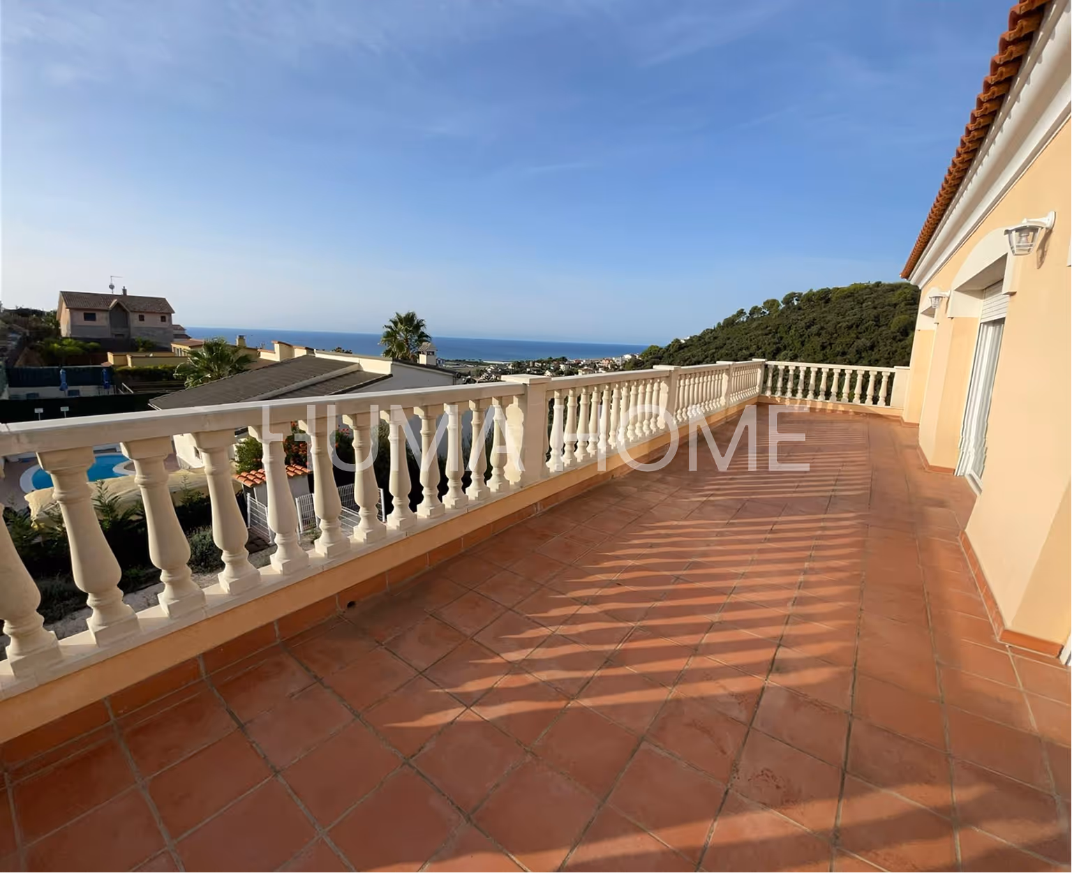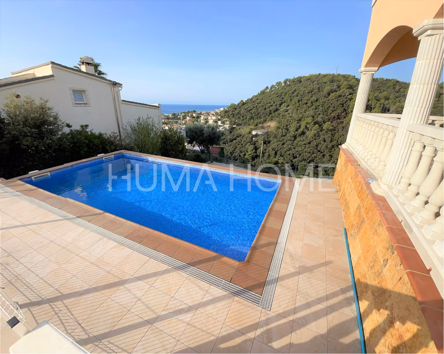 The property is close to the beach and everyday services such as shops, supermarkets, schools, and pharmacies. It is arranged over two floors and offers open views of both the sea and the mountains from every room.