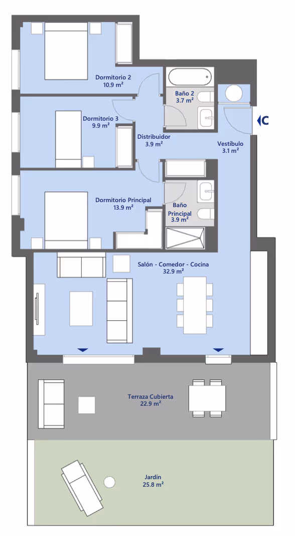 Unit with 3 bedrooms and 2 bathrooms. Built area 125 m²; Usable area 100 m².