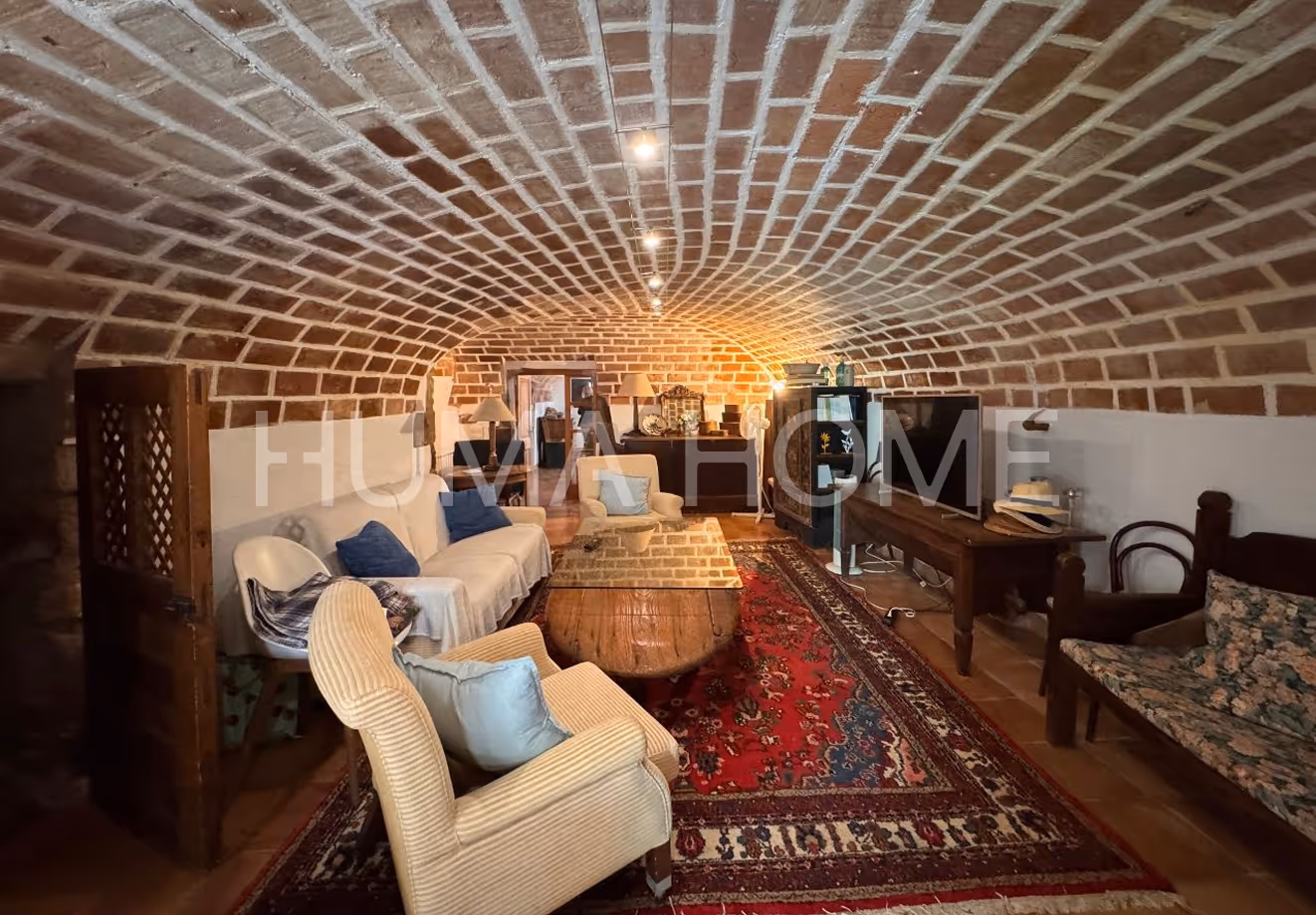 The house is arranged over two floors and has four independent but connected spaces, each fully functional. It includes six bedrooms, five bathrooms, and a kitchen with a dining area and fireplace, with direct access to the outside.