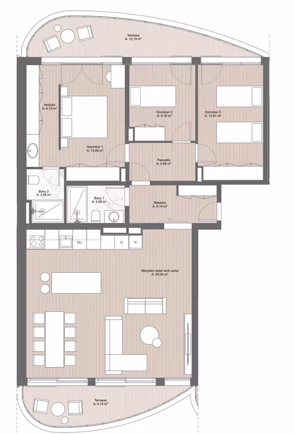 Unit with 3 bedrooms and 2 bathrooms. Built area 125 m²; Usable area 107 m².