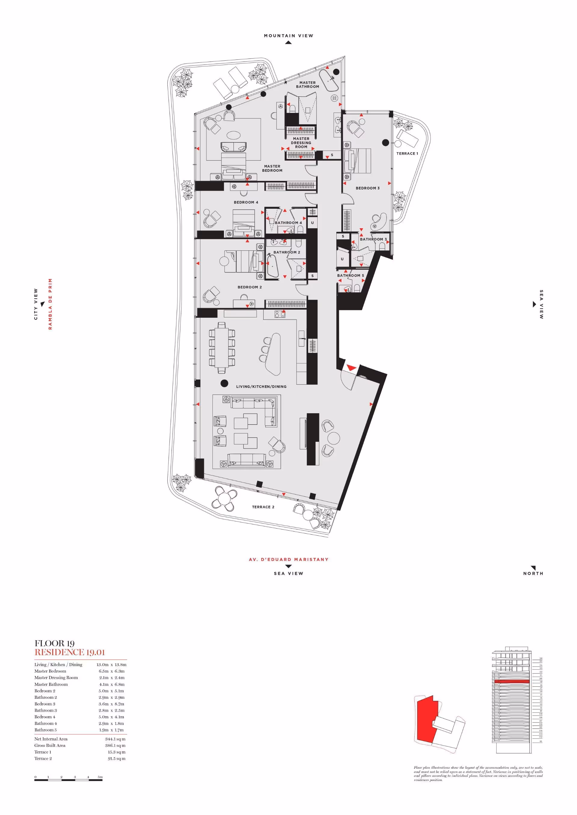 This unit has 4 bedrooms and 5 bathrooms. It includes a built area of 387 m².