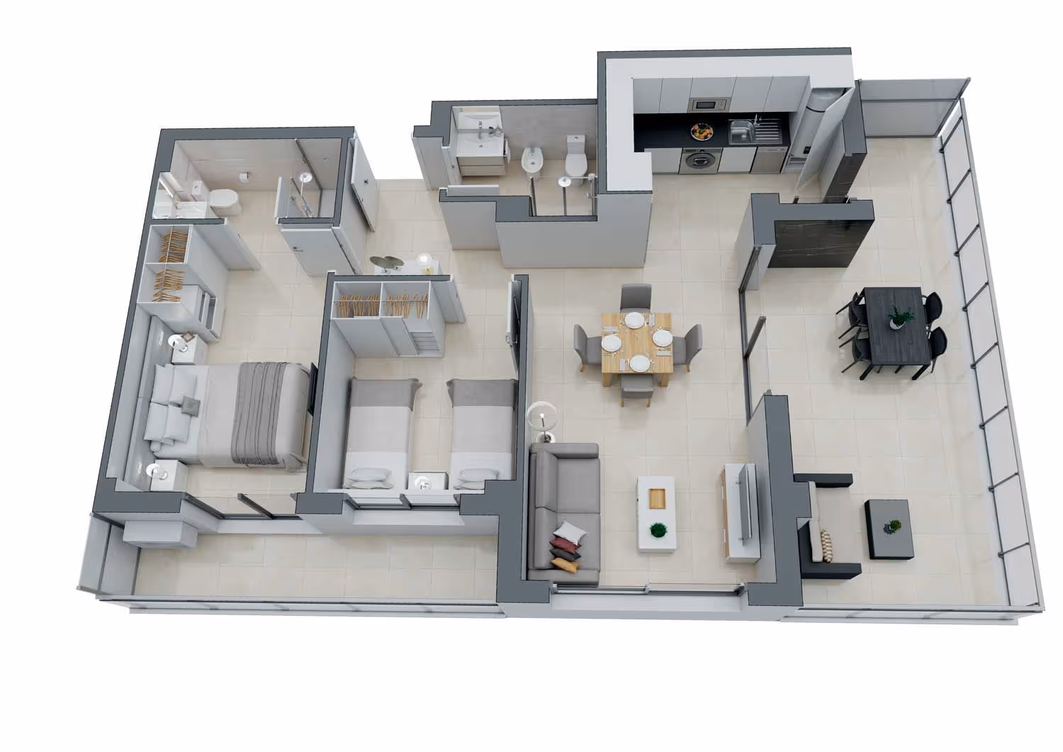 This unit has 2 bedrooms and 2 bathrooms. It includes a built area of 97 m², a usable area of 67 m².