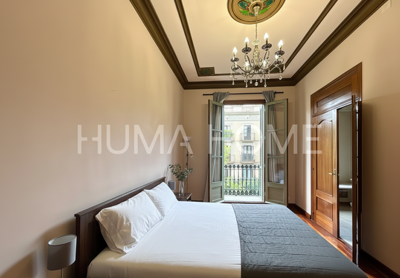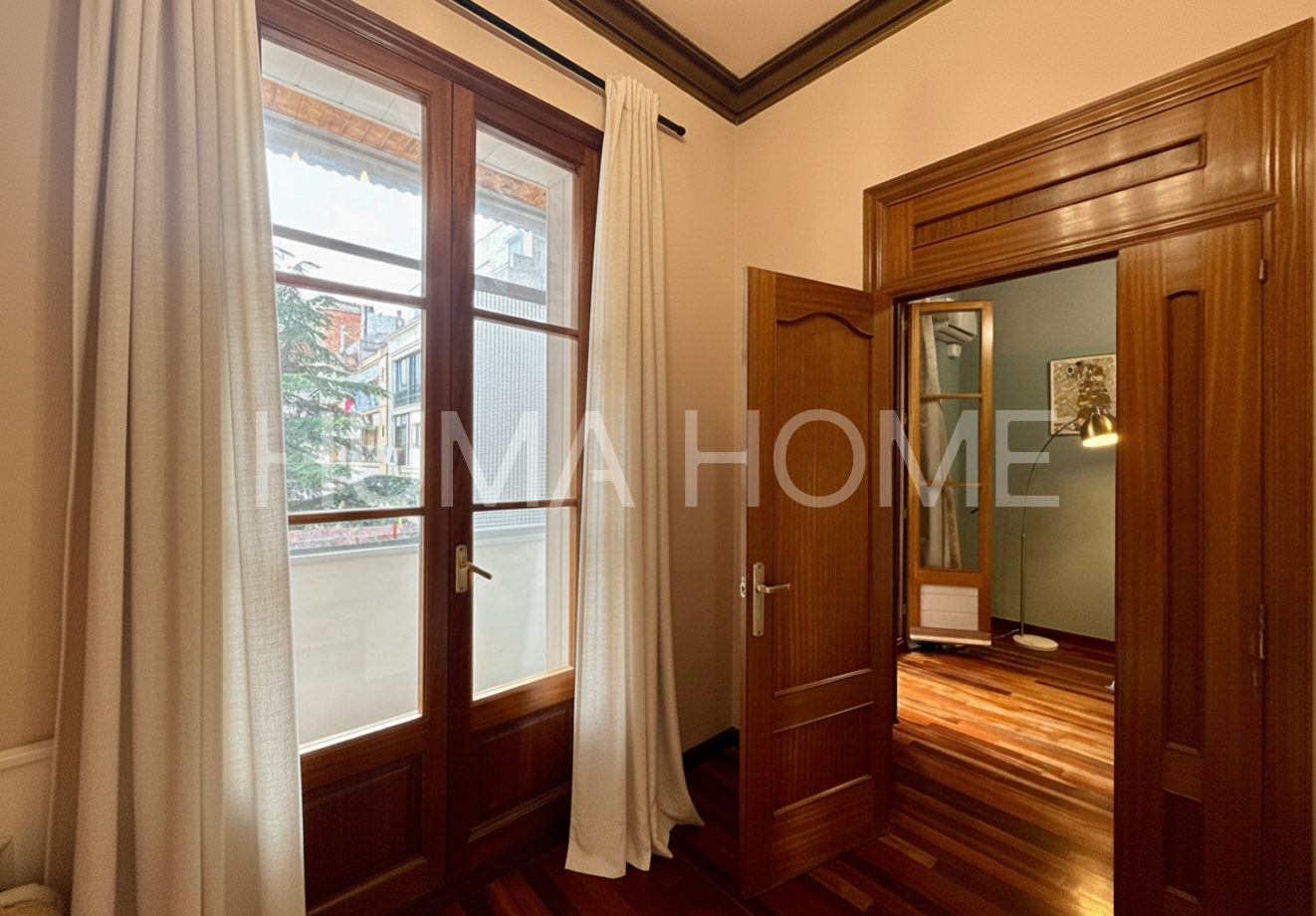 Spacious modernist apartment in an elegant classic building, perfectly located 5 minutes from Paseo de Gracia. Previously divided into two independent units, it now offers ample space for families. The apartment features a living-dining room, main bedroom, office convertible to a second bedroom (with sofa-bed), equipped kitchen, and full bathroom with bathtub. Stunning high ceilings and balconies in every room create a bright, spacious atmosphere. All rooms face the street with charming Bruc street views. The location is unbeatable: Girona metro station 2 minutes away, Mercadona supermarket and multiple restaurants within walking distance. The vibrant neighborhood offers 391 dining options within 15 minutes, from Minamo to La Fuga (Italian with vegan options). Pharmacies, schools, and the beautiful Torre de les Aigües Gardens complete this central, convenient setting. The building does not have an elevator.