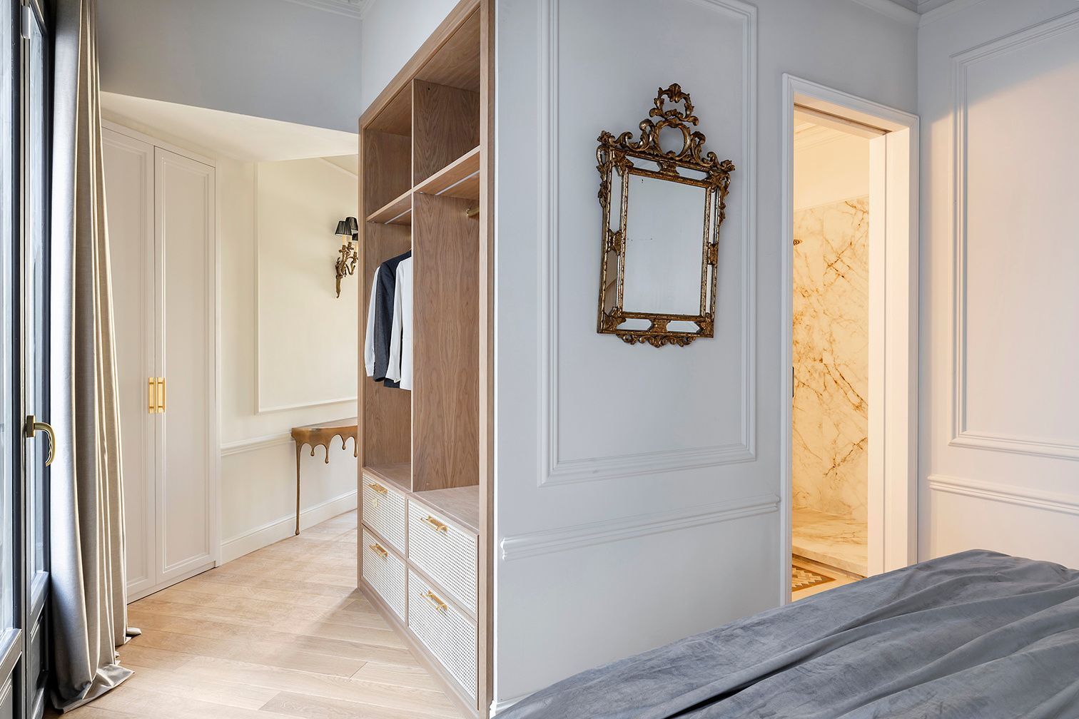 161m² with Private Terrace — Steps from Passeig de Gràcia Exceptional top-floor property in a classic 1900 corner building, occupying the entire fifth floor. Located steps from Passeig de Gràcia and two blocks from Plaza Cataluña, with modern elevator and communal terrace with panoramic views. This bright 161m² apartment offers a perfect layout with 3 completely independent suites ensuring privacy, plus an additional room designed as a walk-in closet. The impressive 3.70-meter ceilings with handcrafted plaster moldings and 7 French balconies with urban views create a unique sense of spaciousness. The 10m² private green terrace adds an exclusive outdoor space. The semi-integrated Italian Doimo Cucine designer kitchen features Siemens appliances, wine cellar, and direct access to the terrace with laundry room. Exceptional materials include French herringbone natural oak floors, natural marble in bathrooms and kitchen, and new custom-made carpentry providing high thermal and acoustic insulation. The apartment features gas radiator heating, underfloor heating in kitchen and bathrooms, two-zone Mitsubishi ducted air conditioning, integrated sound system, indirect LED lighting, and hand-carved marble bioethanol fireplace. All European designer furniture, appliances, decoration, and built-in wardrobes with lighting are included in the price. Designed by prestigious architecture studio and published in specialized magazines. Ready to move in.