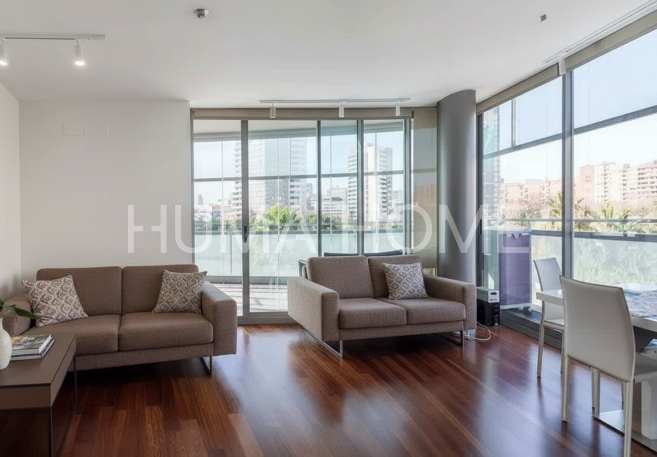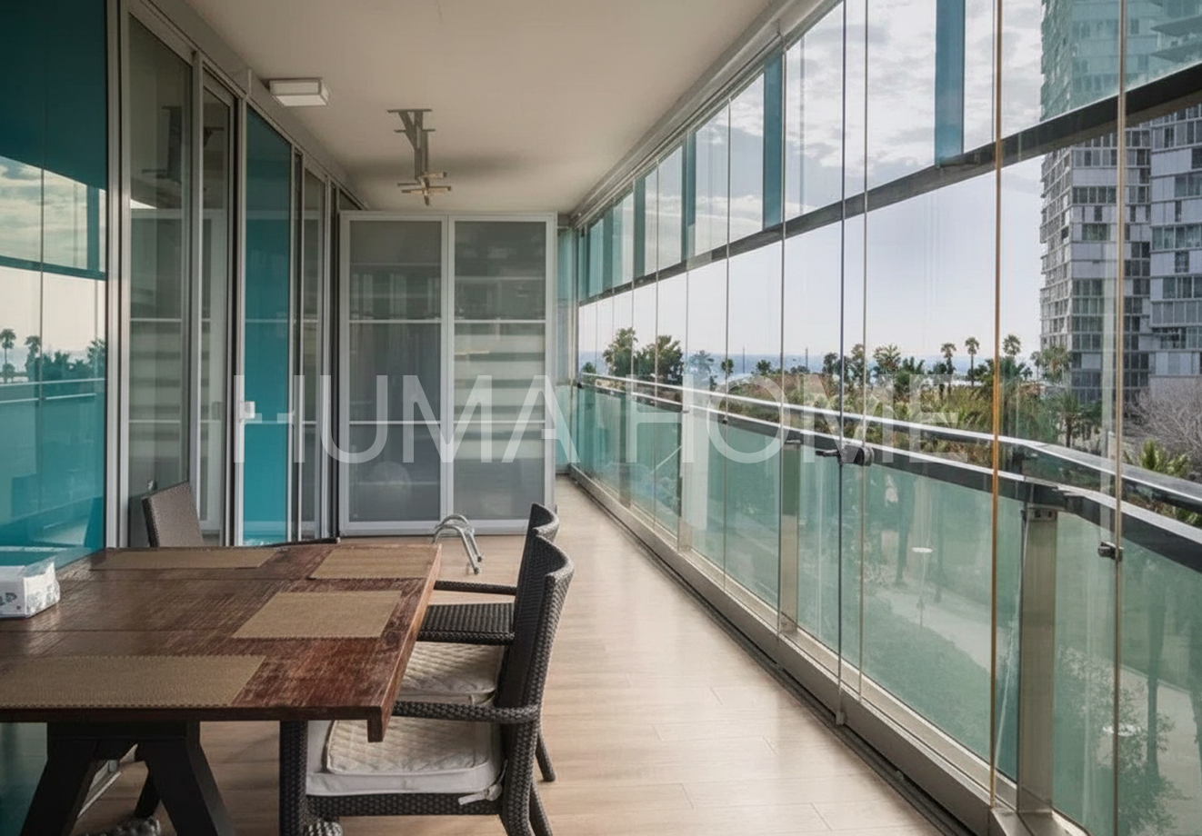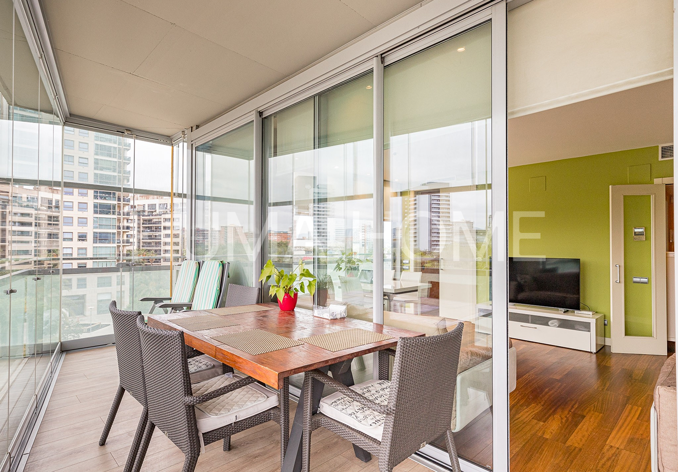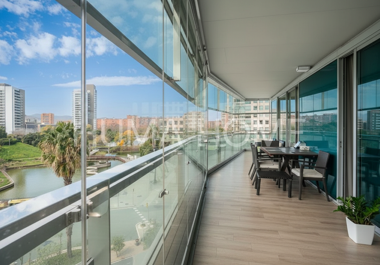 3 Bedrooms, Glazed Terrace - First Line of Sea Apartment with Diagonal Mar Park views in one of the area's most iconic buildings. The height allows views to treetops and the city, offering pleasant and calming vistas. The southwest-facing property features living-dining room, kitchen, three bedrooms, and two bathrooms, one en suite. The generous terrace, accessible from all rooms, is glazed for additional interior space if desired. Includes parking space and storage room in price. Residential complex has 24-hour security, extensive communal area with outdoor pool, gym, paddle tennis court, and children's area. Located between the sea and Barcelona's second largest park, with excellent connection to Ronda Litoral and public transport: metro, buses, and tram. Close to shopping center. Ideal for year-round living or second residence, enjoying the beach without giving up city conveniences.