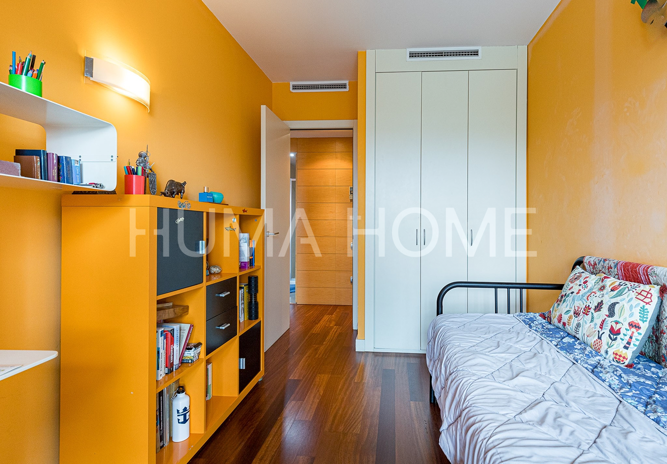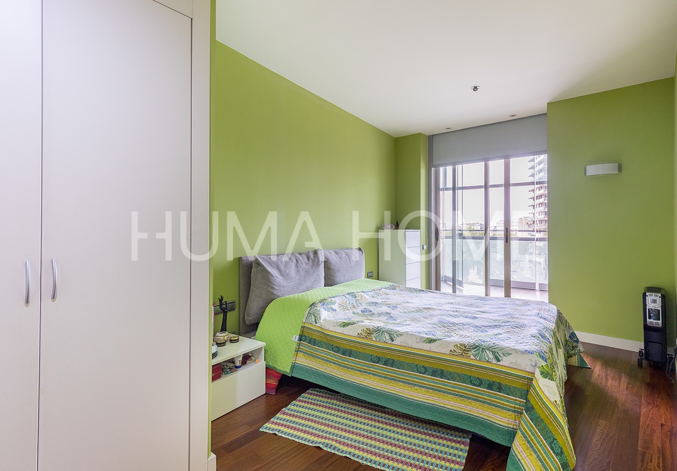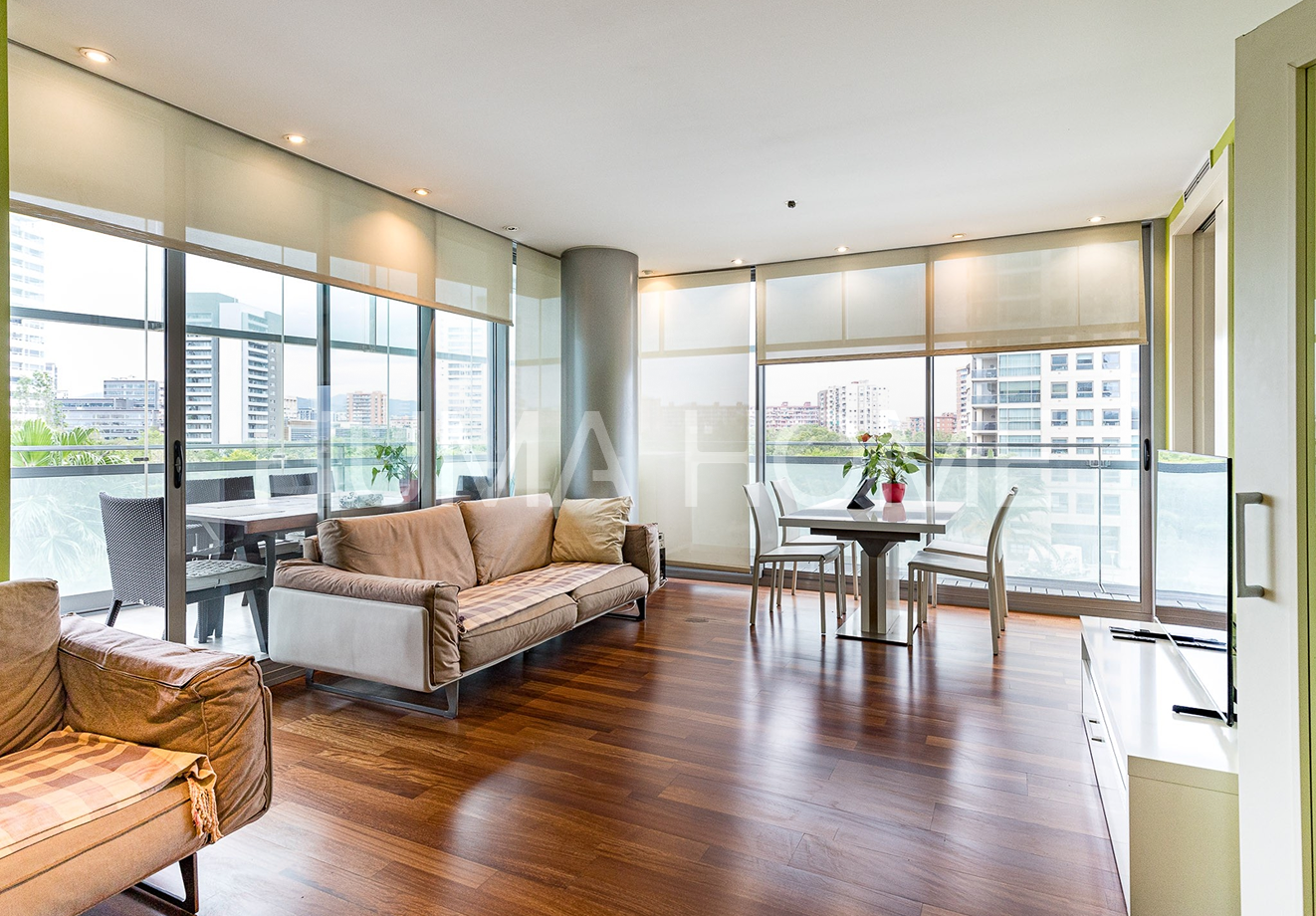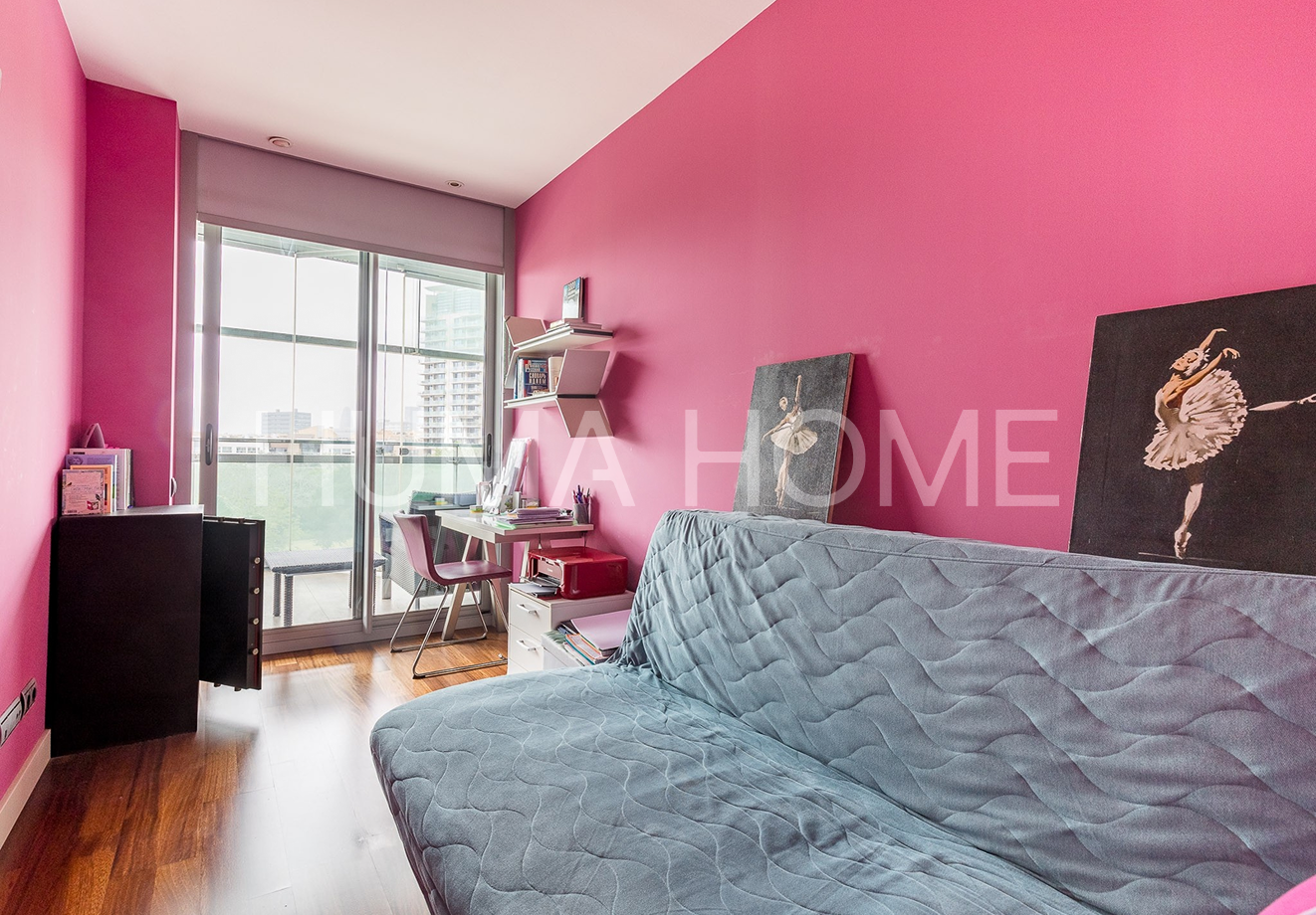 3 Bedrooms, Glazed Terrace - First Line of Sea Apartment with Diagonal Mar Park views in one of the area's most iconic buildings. The height allows views to treetops and the city, offering pleasant and calming vistas. The southwest-facing property features living-dining room, kitchen, three bedrooms, and two bathrooms, one en suite. The generous terrace, accessible from all rooms, is glazed for additional interior space if desired. Includes parking space and storage room in price. Residential complex has 24-hour security, extensive communal area with outdoor pool, gym, paddle tennis court, and children's area. Located between the sea and Barcelona's second largest park, with excellent connection to Ronda Litoral and public transport: metro, buses, and tram. Close to shopping center. Ideal for year-round living or second residence, enjoying the beach without giving up city conveniences.