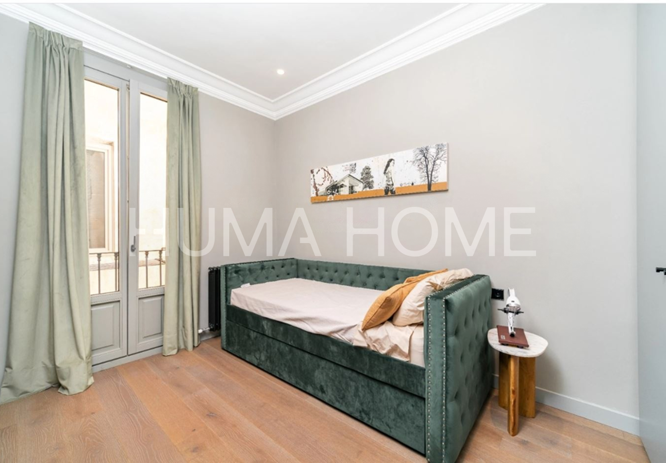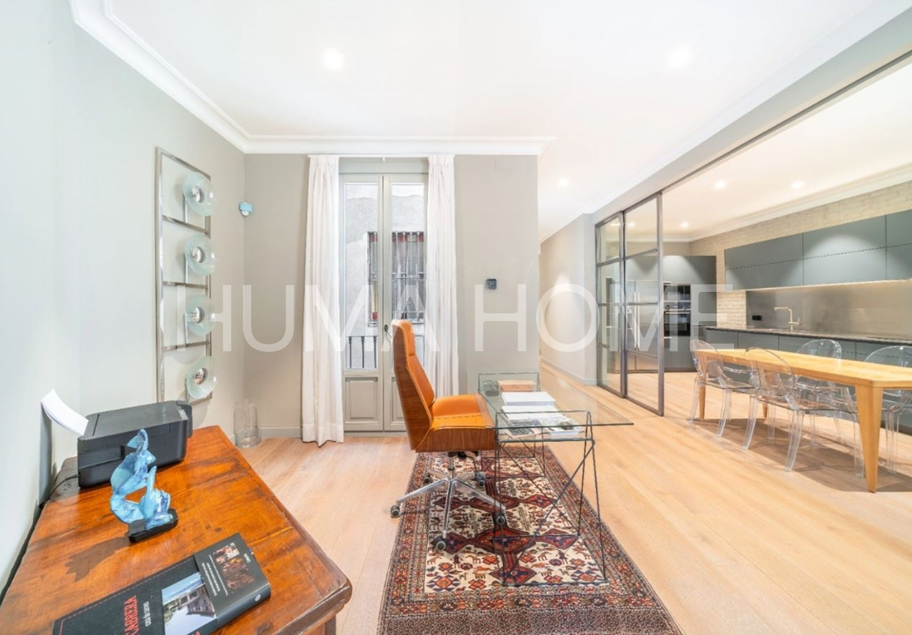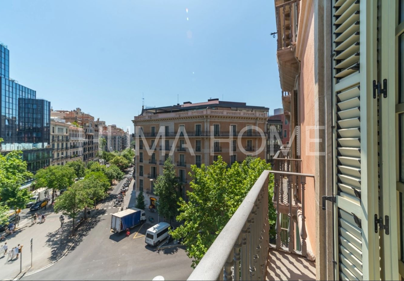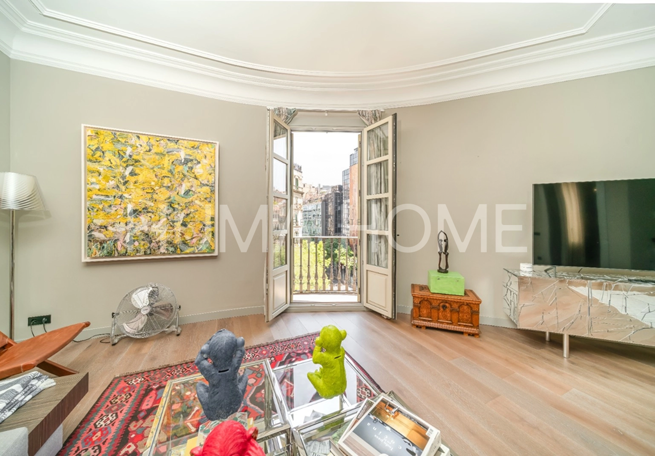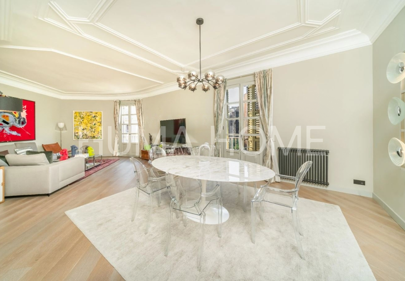 Eixample - 3 Bedrooms, Modern Layout Recently renovated apartment in classic representative Eixample building, next to Paseo de Gracia. Excellent location for walking distance to good restaurants and shops. The property features very modern layout. Large-format living-dining room with windows to street on corner of block, with pleasant views. Office area next to living-dining room. Modern kitchen with sliding door for independence and possibility of dining inside. Guest toilet and laundry-type area. Master suite with dressing room and full bathroom, double bedroom, single bedroom, and full bathroom with shower. Sold unfurnished.