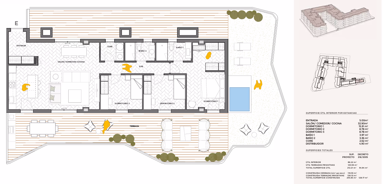 This unit has 3 bedrooms and 2 bathrooms. It includes a built area of 255 m².