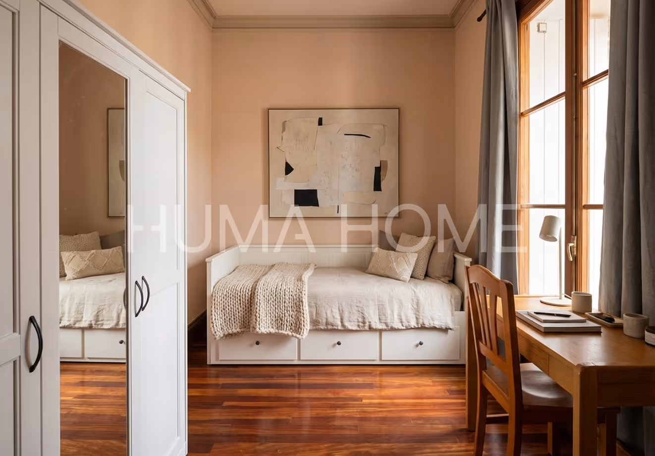 Previously divided into two independent units, it now offers ample space for families. The apartment features a living-dining room, main bedroom, office convertible to a second bedroom (with sofa-bed), equipped kitchen, and full bathroom with bathtub.