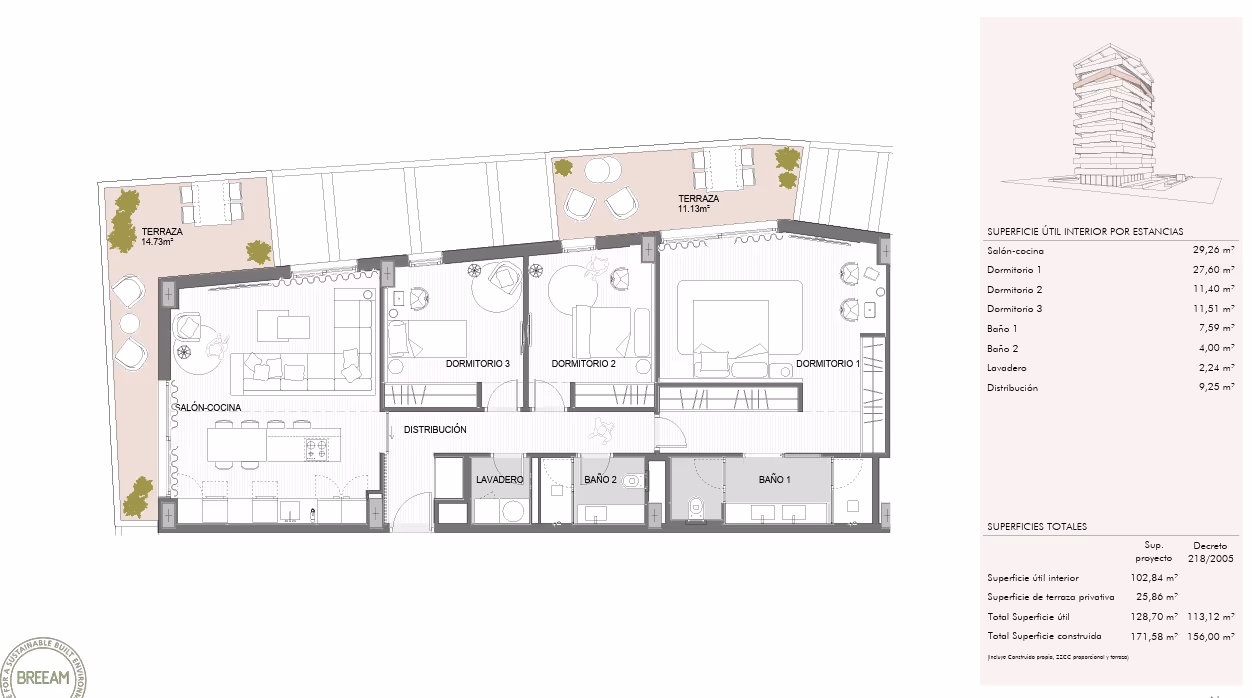 Unit with 3 bedrooms and 2 bathrooms. Built area 172 m².