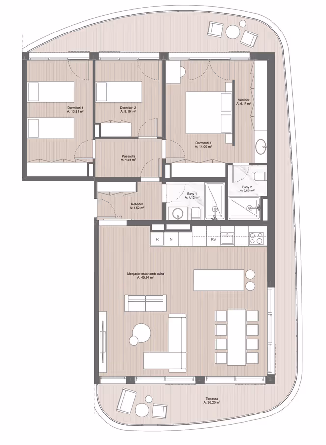 Exclusive 1-bedroom, 2-bathroom penthouse with a large private terrace in NAVAS 270, a distinctive development that blends industrial heritage with contemporary architecture. Situated on a bright corner in the lively Sant Martí district, the property offers 62 m² of interior space plus a 44 m² private terrace with open panoramic views. The building, originally from 1969, has been fully transformed while preserving its industrial character through exposed structures, concrete beams, and geometric forms complemented by expansive glass façades and Catalan vaulted ceilings.
