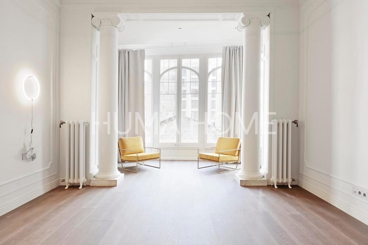 Spacious modernist apartment in an elegant classic building, perfectly located 5 minutes from Paseo de Gracia. Previously divided into two independent units, it now offers ample space for families. The apartment features a living-dining room, main bedroom, office convertible to a second bedroom (with sofa-bed), equipped kitchen, and full bathroom with bathtub. Stunning high ceilings and balconies in every room create a bright, spacious atmosphere. All rooms face the street with charming Bruc street views. The location is unbeatable: Girona metro station 2 minutes away, Mercadona supermarket and multiple restaurants within walking distance. The vibrant neighborhood offers 391 dining options within 15 minutes, from Minamo to La Fuga (Italian with vegan options). Pharmacies, schools, and the beautiful Torre de les Aigües Gardens complete this central, convenient setting. The building does not have an elevator.