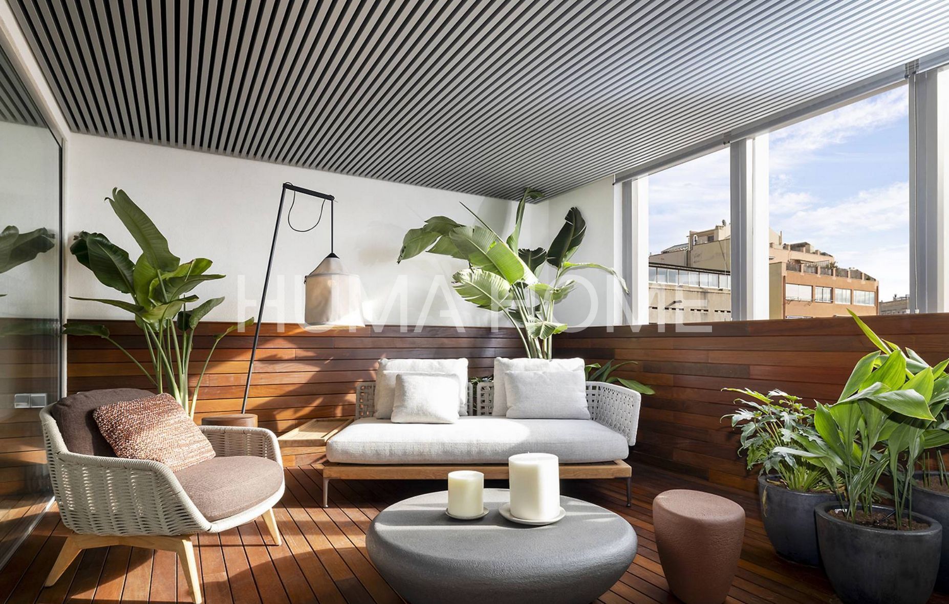 161m² with Private Terrace — Steps from Passeig de Gràcia Exceptional top-floor property in a classic 1900 corner building, occupying the entire fifth floor. Located steps from Passeig de Gràcia and two blocks from Plaza Cataluña, with modern elevator and communal terrace with panoramic views. This bright 161m² apartment offers a perfect layout with 3 completely independent suites ensuring privacy, plus an additional room designed as a walk-in closet. The impressive 3.70-meter ceilings with handcrafted plaster moldings and 7 French balconies with urban views create a unique sense of spaciousness. The 10m² private green terrace adds an exclusive outdoor space. The semi-integrated Italian Doimo Cucine designer kitchen features Siemens appliances, wine cellar, and direct access to the terrace with laundry room. Exceptional materials include French herringbone natural oak floors, natural marble in bathrooms and kitchen, and new custom-made carpentry providing high thermal and acoustic insulation. The apartment features gas radiator heating, underfloor heating in kitchen and bathrooms, two-zone Mitsubishi ducted air conditioning, integrated sound system, indirect LED lighting, and hand-carved marble bioethanol fireplace. All European designer furniture, appliances, decoration, and built-in wardrobes with lighting are included in the price. Designed by prestigious architecture studio and published in specialized magazines. Ready to move in.