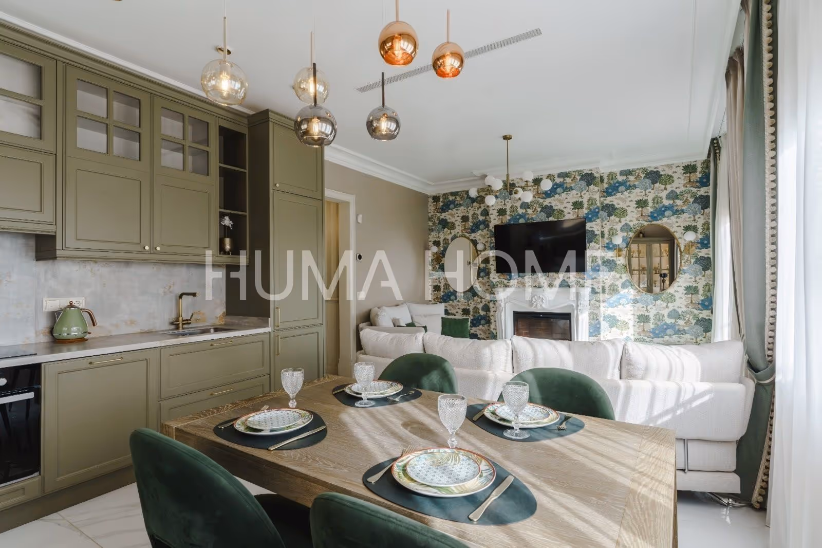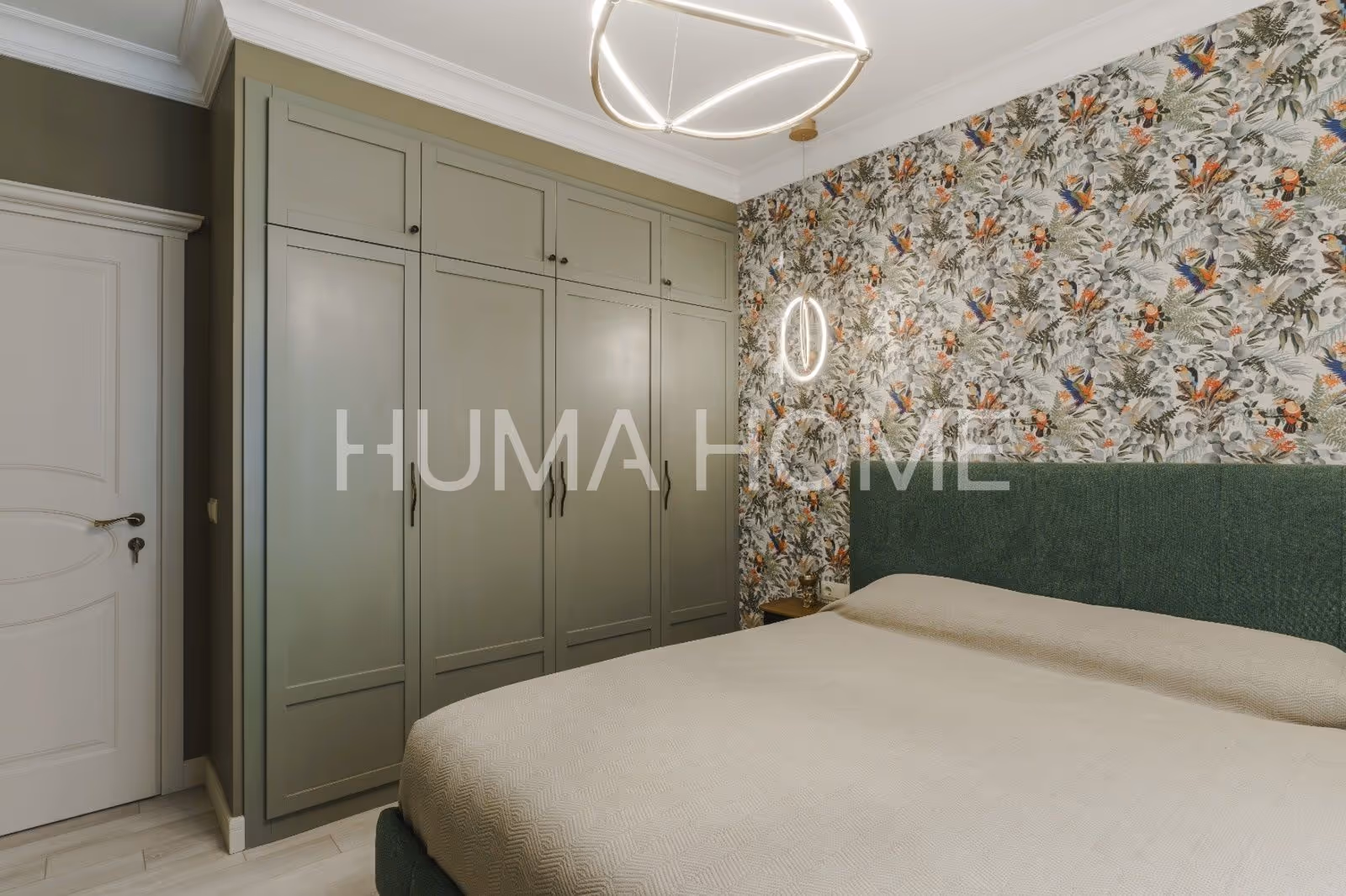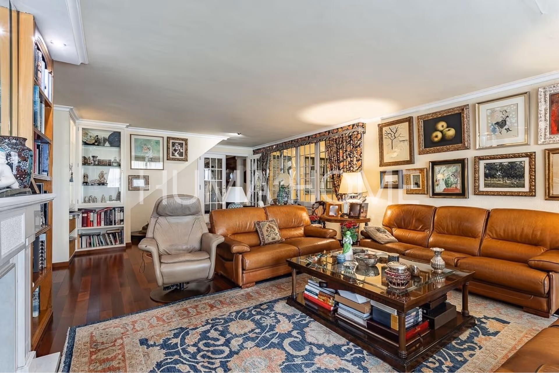 This elegant corner apartment is located on the fourth floor of a historic 1900 building on the pedestrian Consell de Cent street, just one block from Passeig de Gracia. The apartment is fully exterior and flooded with natural light, offering views of quiet streets, greenery, and historical monuments. With 201 m², it features a spacious entrance, four double bedrooms (including two suites), three bathrooms, and a large living-dining area. The kitchen, from Italian brand Novacucina and equipped with Smeg appliances and a wine cellar, includes a functional island. High ceilings (3 meters) and French Herringbone oak floors create a feeling of space and elegance. The property has been completely renovated using premium materials, including handcrafted plaster cornices, marble finishes, and custom furniture. Additional features include floor heating in the kitchen, hall, and bathrooms, two air conditioning ducts, LED and indirect lighting, integrated sound system, and a security system.