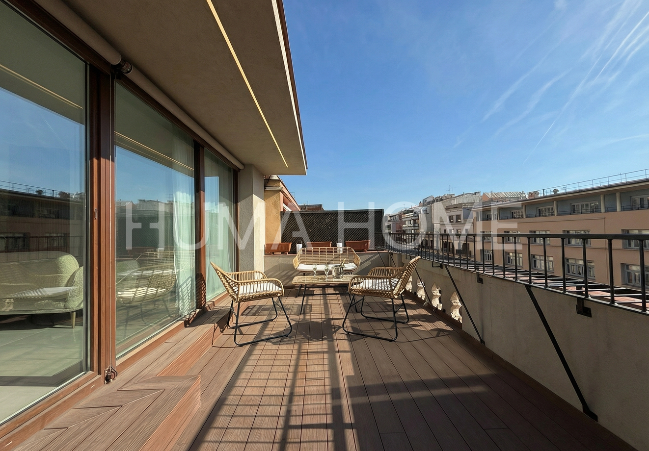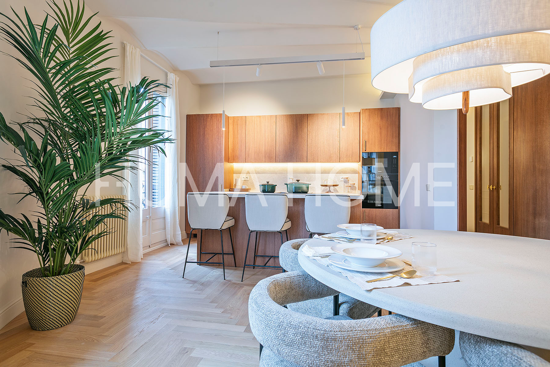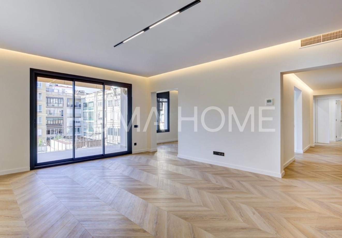 Fully Renovated Apartment next to Plaza Universidad — 132m² with Luxury Finishes — Full Floor in Stately Building Magnificent 132m² built apartment fully renovated in 2023, located in central Barcelona next to Plaza Universidad. The property occupies a complete floor, offering very spacious areas and total privacy. The finishes are high-end with built-in wardrobes, ducted air conditioning, perimeter ceiling lighting, and parquet flooring throughout. The luxury kitchen features a central island and Franke faucets, while the bathrooms are clad in marble with premium finishes. The layout includes four bedrooms, three doubles (one en-suite) and one single. Located in a stately building with representative entrance, the building has an elevator and communal rooftop terrace with open city views, ideal for enjoying the outdoors without leaving home. The location is one of the most sought-after in Barcelona, with excellent public transport connections and quick access to the city's main routes. The Sant Antoni area offers all services, shops, and neighborhood life nearby, perfect for both living and investing.