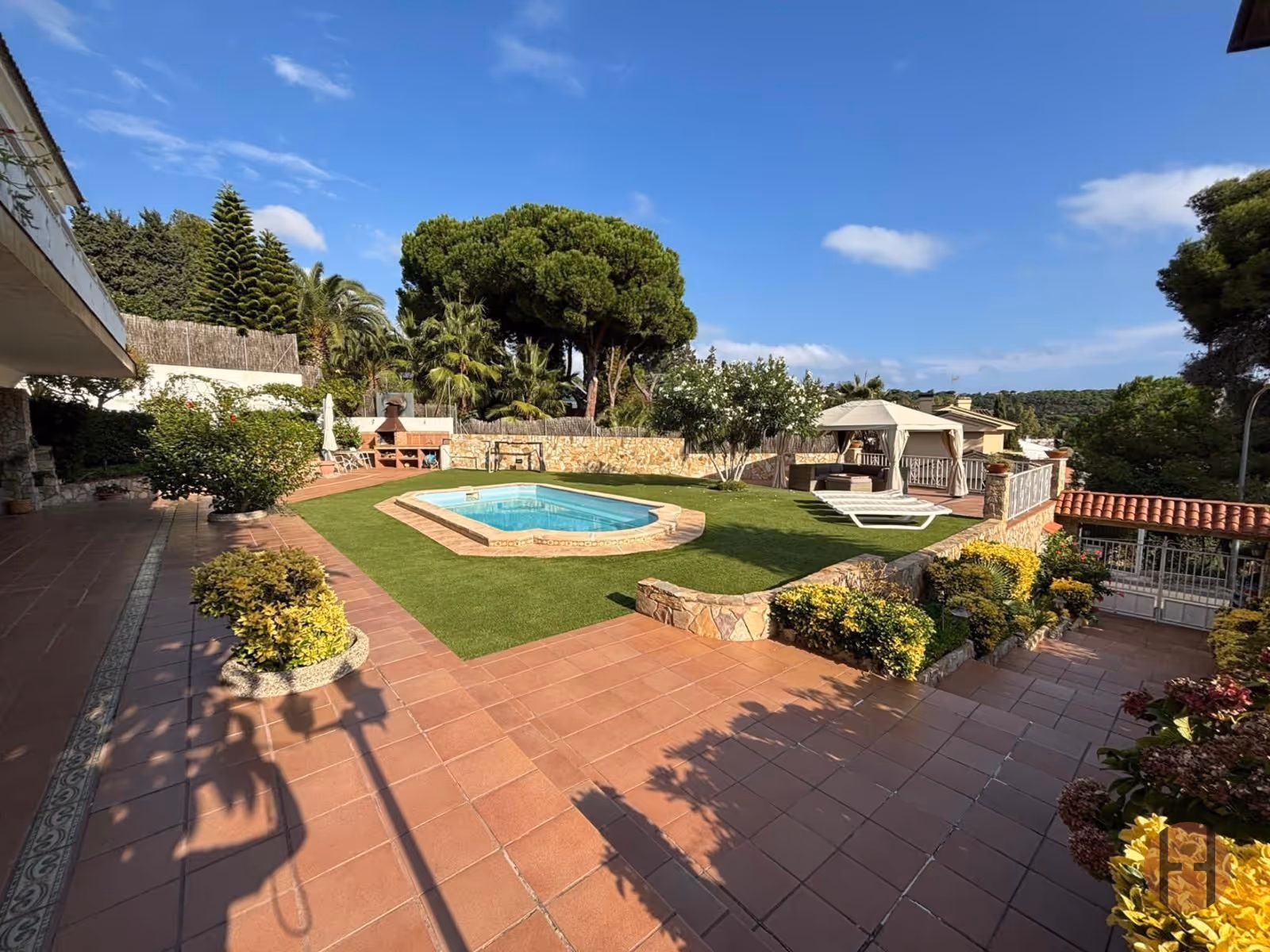 423m² on Flat 864m² Plot - Near Beach and Services. Spacious 423m² villa on a flat 864m² plot, located in a quiet privileged area of Lloret de Mar with easy access to supermarkets, beach, bus stop, and town center. The flat terrain is an uncommon advantage in the area that makes the outdoor space especially comfortable. The house is carefully designed and ideal for both permanent residence and vacation. Currently divided into two apartments and a studio with independent entrances, which can be connected if desired. The first floor is a complete apartment with spacious living room, separate kitchen, 3 bedrooms (one suite with jacuzzi), and 2 bathrooms. The living room and kitchen open onto a large terrace with pool and garden views. The ground floor comprises an apartment with beautiful living room with American kitchen and access to the pool area, 2 bedrooms and bathroom with shower, plus an independent studio with kitchen and bathroom. The grounds feature a pool, beautiful garden with barbecue area, solarium, and terraces for relaxation. A perfect combination of panoramic views, functionality, and comfort on the Costa Brava.